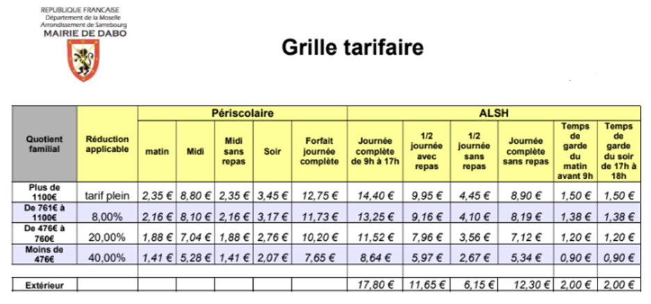 - Dabo : le lundi - mardi - jeudi - vendredi à partir de 7h, durant la pause méridienne (pour les enfants scolarisés dans les écoles de Dabo) et après l'école jusqu'à 18h30 ;